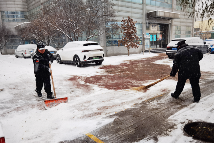 大雪压城,华腾拓展公司迅速响应,每天派出50余名职工进行扫雪铲冰行动。为了确保在写字楼中办公的客户出行和业务不受影响,华腾拓展职工冒雪开展扫雪铲冰工作,并对主要路段使用融雪剂进行融雪作业,防止结冰打滑产生安全事故。